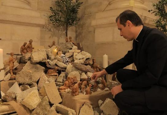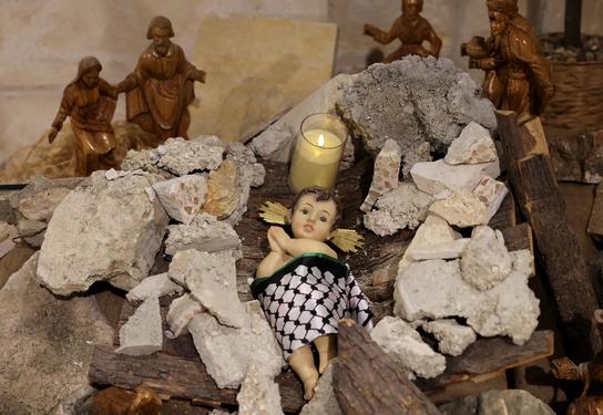 Above: Rev. Dr. Munther Isaac and the nativity display at the Evangelical Lutheran Church in Bethlehem, December 2023. This display and Rev. Isaac's sermon were widely reported around the world.