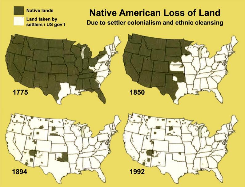 "Shrinking Palestine" mapcards have long been a staple educational tool in the movement for Palestinian rights. The illustration of the ethnic cleansing of Native Americans, also due to settler colonialism, is a similarly striking visual lesson.