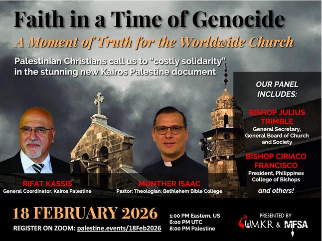 February 5, 2026 – On February 18, at 1:00 pm Eastern (US), United Methodists for Kairos Response (UMKR) and Methodist Federation for Social Action (MFSA) will introduce the historic Kairos Palestine II document in the United Methodist Church.